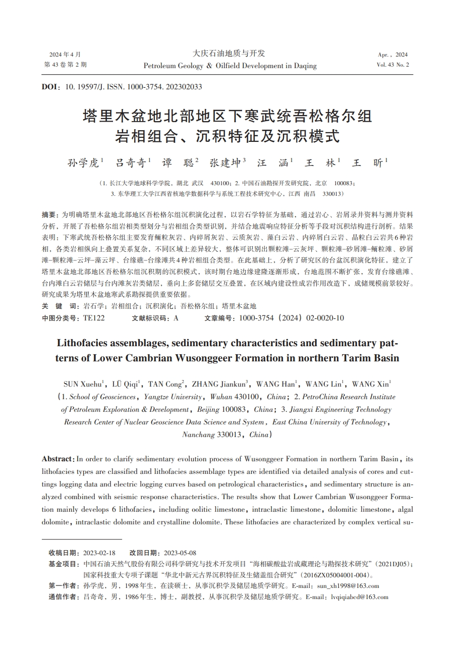 公司硕士生孙学虎在《大庆石油地质与开发》上发表了题为“塔里木盆地北部地区下寒武统吾松格尔组岩相组合、沉积特征及沉积模式”的研究论文,采用岩相学、沉积学的方法,分析了塔北地区下寒武统吾松格尔组沉积特征演化过程。beats365为论文第一署名单位,孙学虎为第一作者,导师吕奇奇副教授为通讯作者。