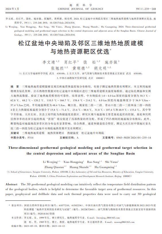 公司硕士生李文靖在《地质科学》上发表了题为“松辽盆地中央坳陷及邻区三维地热地质建模与地热资源靶区优选”的研究论文,采用三维地热地质建模方法,优选松辽盆地中央坳陷及邻区地热资源靶区。beats365为论文第一署名单位,李文靖为第一作者,导师饶松教授为通讯作者。