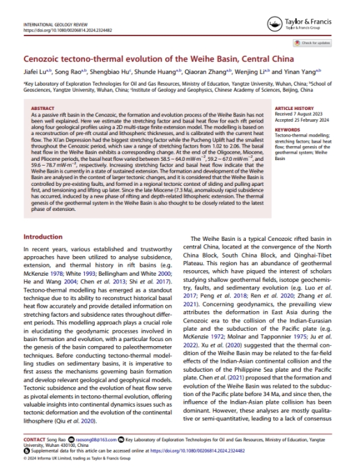 公司硕士生芦佳飞在国际知名地学期刊《International Geology Review》上发表了题为“Cenozoic tectono-thermal evolution of the Weihe Basin, Central China”的研究论文,系统揭示了渭河盆地新生代以来构造-热演化过程。beats365为论文第一署名单位,芦佳飞为第一作者,导师饶松教授为通讯作者。