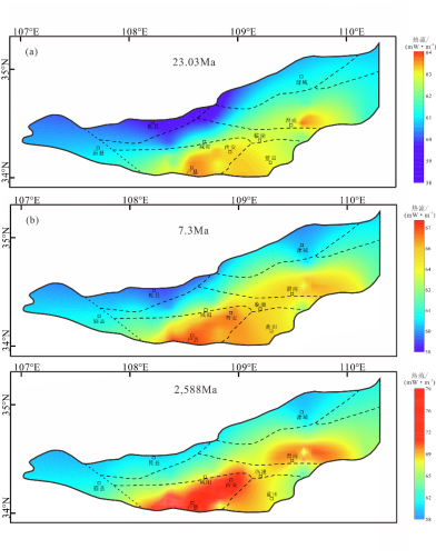 图2渭河盆地新生代以来基底热流图。(a)白鹿塬组沉积结束时;(b)蓝田-灞河组沉积结束时;(c)张家坡组沉积结束时