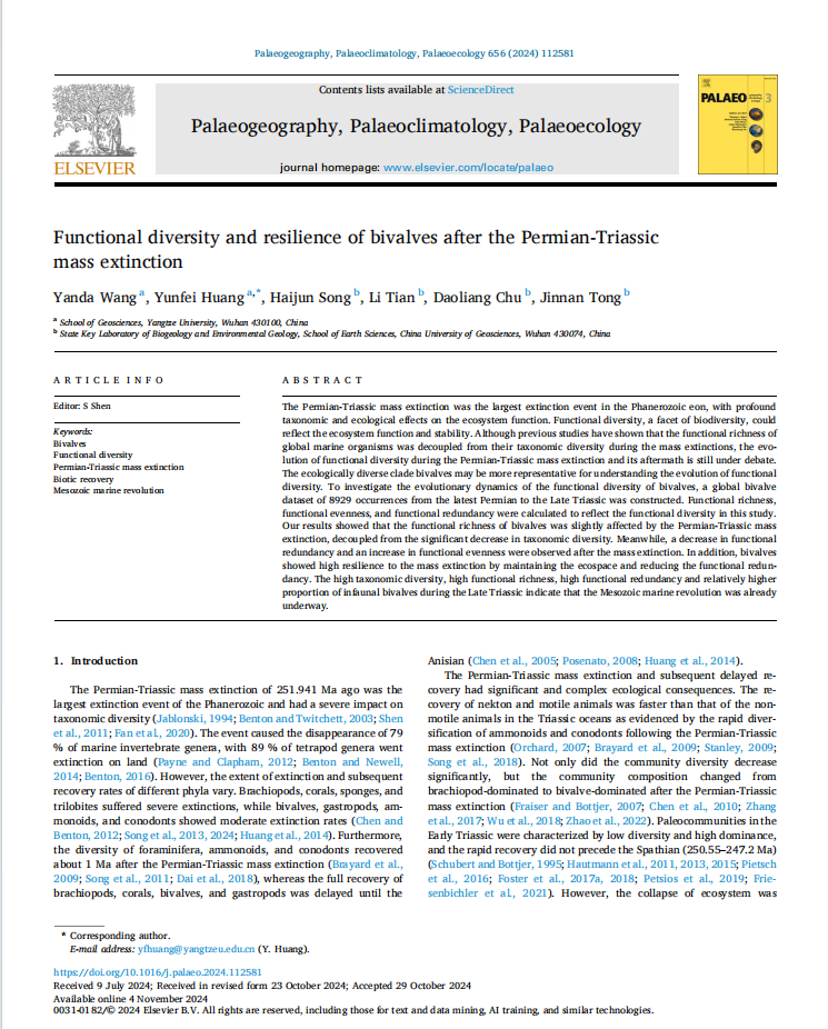 beats365官方网站黄云飞教授团队长期从事古-中生代之交重大地质转折期生物灭绝与生物复苏方面的研究,团队成员王延达在古生物学国际1区SCI期刊《Palaeogeography, Palaeoclimatology, Palaeoecology》上发表题为“Functional diversity and resilience of bivalves after the Permian-Triassic mass extinction”的研究论文。beats365官方网站为论文第一署名单位,硕士研究生王延达为论文第一作者,其导师黄云飞教授为该文通讯作者。