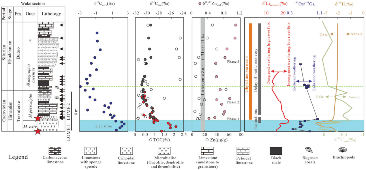 本次研究认为晚奥陶世赫南特晚期全球硫化水体面积的扩张导致了晚奥陶世第二幕生物灭绝事件的发生,鲁丹期全球大陆风化作用驱动的海洋水体持续缺氧不仅抑制了早志留世生物的复苏,并促进了有机碳的埋藏和华南龙马溪组富有机质页岩(页岩气开发重要层位)的沉积。此外,早志留世强烈的大陆风化作用和减弱的反风化作用均降低了大气二氧化碳浓度,共同促进了该时期冰室气候的形成。总之,本次研究基于碳酸盐岩锌同位素证据重建了早志留世全球海洋锌同位素组成,不仅揭示了早志留世这一重要地质历史时期大陆风化作用、海洋水体缺氧、生物复苏的协同演化过程,同时也为华南页岩气重要烃源岩(下志留统龙马溪组)的广泛沉积机制提供了关键证据(图3)。