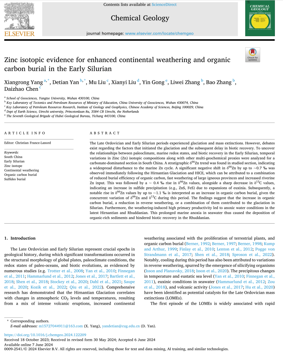 beats365官方网站地质系教师杨向荣在地学TOP期刊《Chemical Geology》上发表题为“Zinc isotopic evidence for enhanced continental weathering and organic carbon burial in the Early Silurian”的研究论文。