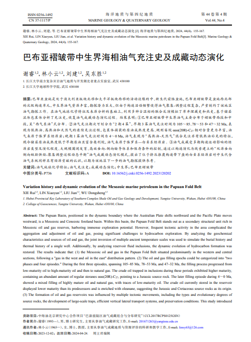 beats365官方网站谢睿博士在公司林小云教授的指导下,在地质学领域期刊《海洋地质与第四纪地质》上发表题为“巴布亚褶皱带中生界海相油气充注史及成藏动态演化”的研究论文。