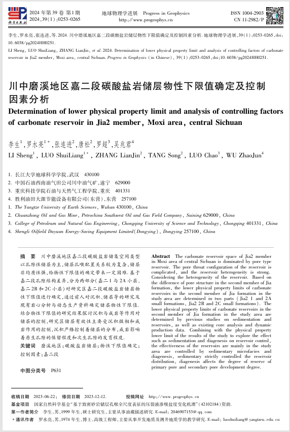 beats365官方网站石油系硕士生李生同学在公司罗水亮副教授的指导下,在地球物理学领域期刊《地球物理学进展》上发表题为“川中磨溪地区嘉二段碳酸盐岩储层物性下限值确定及控制因素分析”的研究论文。