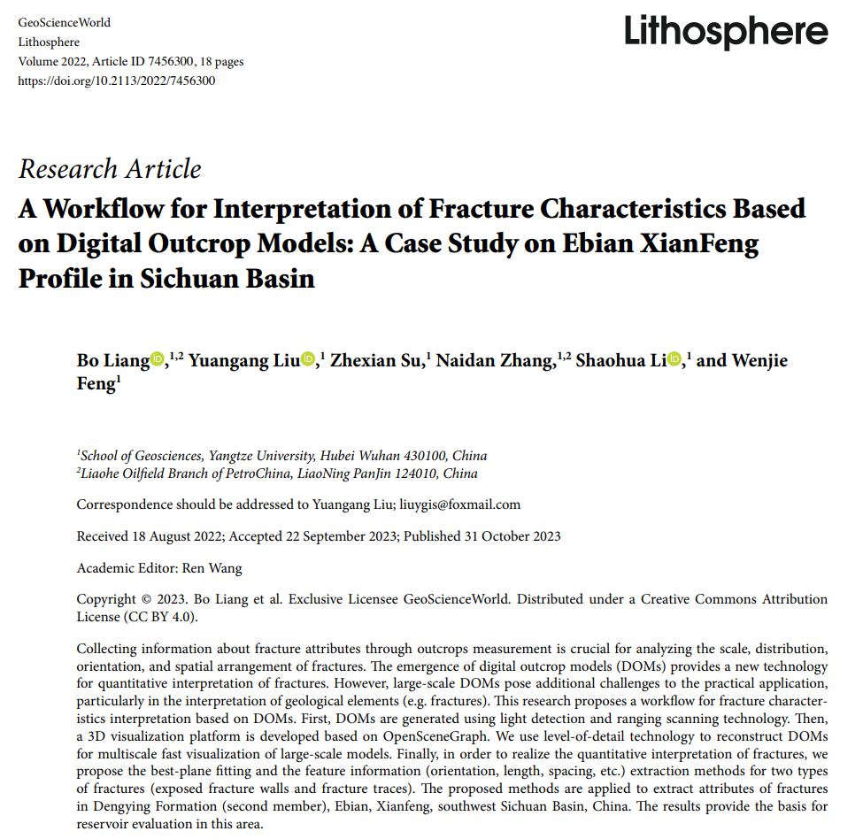 beats365官方网站硕士生梁博在地学期刊《Lithosphere》上发表了题为“A Workflow for Interpretation of Fracture Characteristics Based on Digital Outcrop Models: A Case Study on Ebian Xianfeng Profile in Sichuan Basin”的研究论文。beats365官方网站为论文第一署名单位,梁博为第一作者,其导师刘远刚副教授为该文通讯作者。