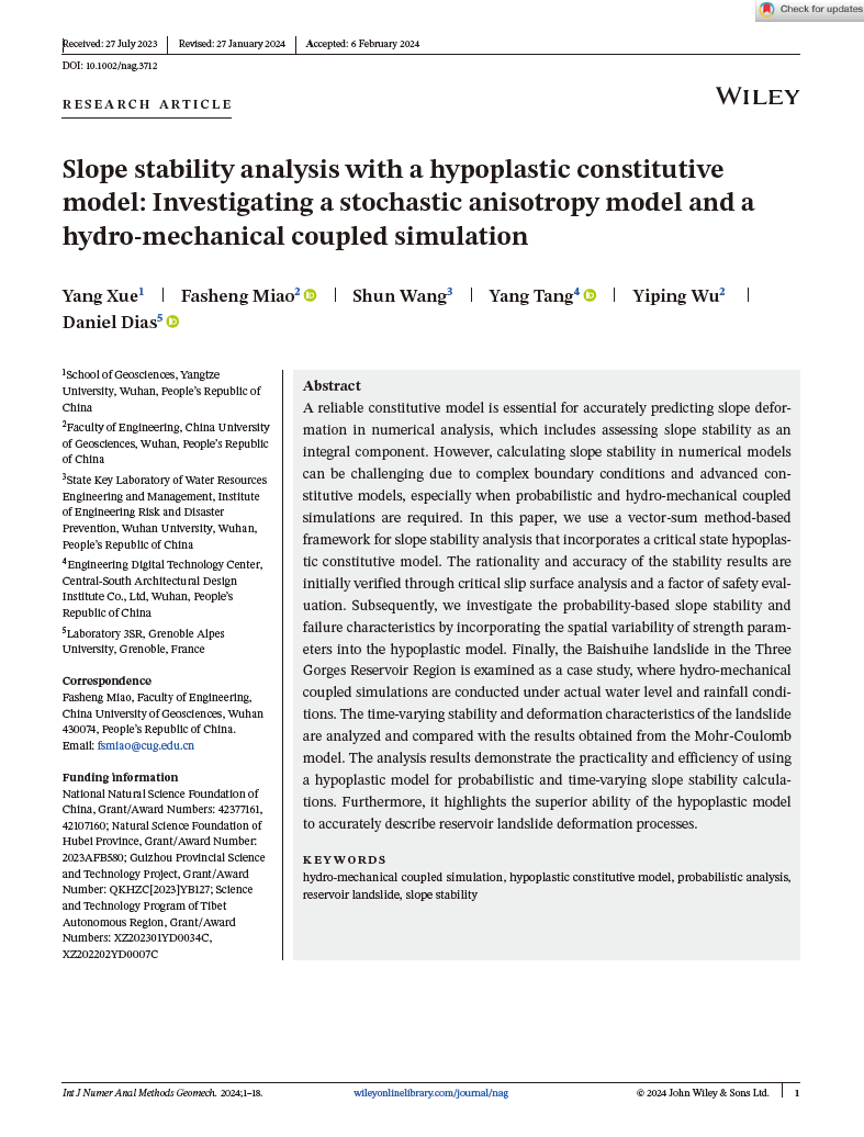 beats365官方网站地质系教师薛阳博士以第一作者身份在计算机岩土领域老牌期刊《International Journal for Numerical and Analytical Methods in Geomechanics》上发表题为“Slope stability analysis with a hypoplastic constitutive model: investigating a stochastic anisotropy model and a hydro-mechanical coupled simulation”的论文。本项研究得到了国家自然科学基金项目和西藏自治区科技项目的资助。