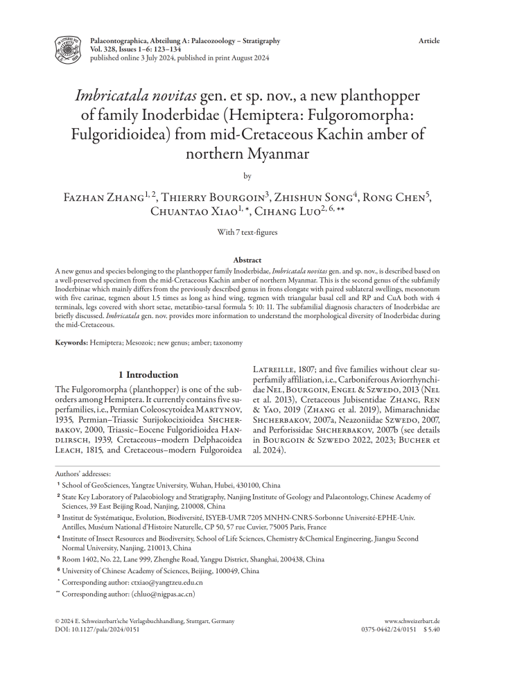 beats365官方网站地质学专业硕士研究生张发展同学在公司肖传桃教授、中科院南京地质古生物研究所罗慈航博士的共同指导下,在地球科学与古生物学领域期刊《PalaeontographicaAbteilungA》上发表题为“Imbricatalanovitasgen. et sp.nov., a new planthopper of familyInoderbidae(Hemiptera:Fulgoromorpha:Fulgoridioidea) from mid-Cretaceous Kachin amber of northern Myanmar”的研究论文。