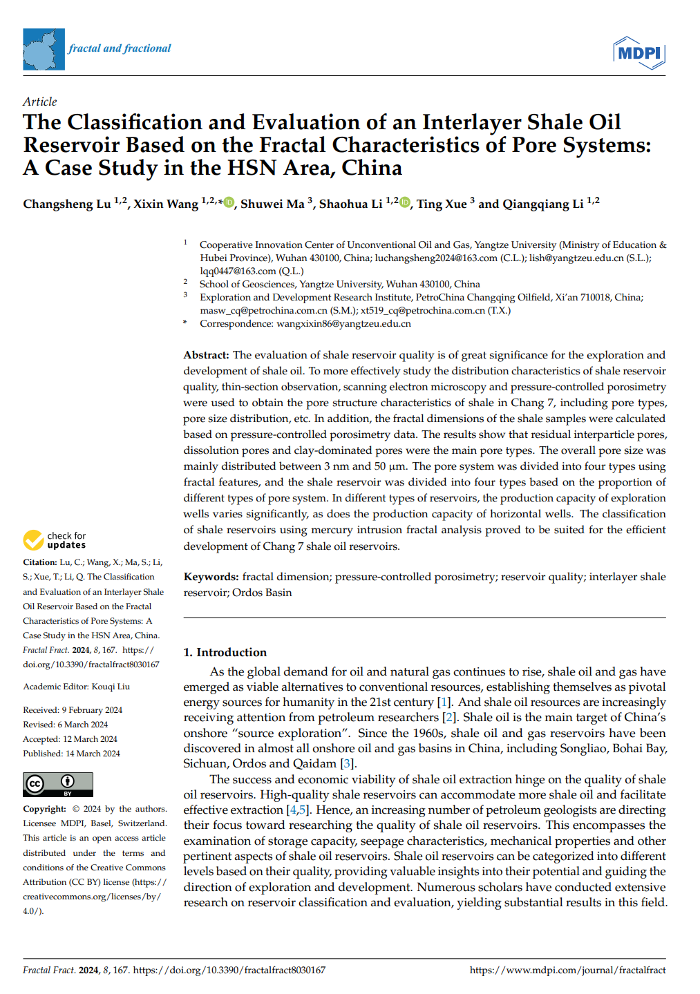 beats365官方网站石油系王喜鑫博士在石油地质学领域主流期刊《Fractal and fractional》上发表题为“TheClassiffcationand Evaluation of an Interlayer Shale Oil Reservoir Based on the Fractal Characteristics of Pore Systems: A Case Study in the HSN Area, China”的研究论文。