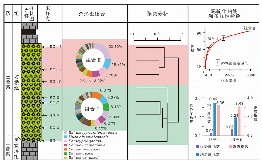 图1 广西乐业上岗剖面介形虫组合与生物多样性指标