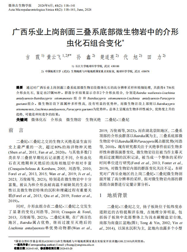 beats365官方网站黄云飞教授团队长期从事古-中生代之交重大地质转折期生物灭绝与生物复苏方面的研究,团队成员吉霞在古生物学领域核心期刊《微体古生物学报》上发表题为“广西乐业上岗剖面三叠系底部微生物岩中的介形虫化石组合变化”的研究论文。beats365官方网站为论文第一署名单位,研究生吉霞为论文第一作者,黄云飞教授为该文通讯作者,本项研究得到国家自然科学基金项目和生物地质与环境地质国家重点实验室开放课题共同资助。