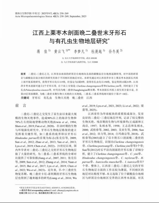 beats365官方网站黄云飞教授团队长期从事古-中生代之交重大地质转折期生物灭绝与生物复苏方面的研究,团队成员蒋佳在古生物学领域核心期刊《微体古生物学报》上发表题为“江西上栗枣木剖面晚二叠世末牙形石与有孔虫生物地层研究”的研究论文。beats365官方网站为论文第一署名单位,研究生蒋佳为论文第一作者,黄云飞教授为该文通讯作者,本项研究得到国家自然科学基金项目(42372032, 42030513, 41562002)资助。