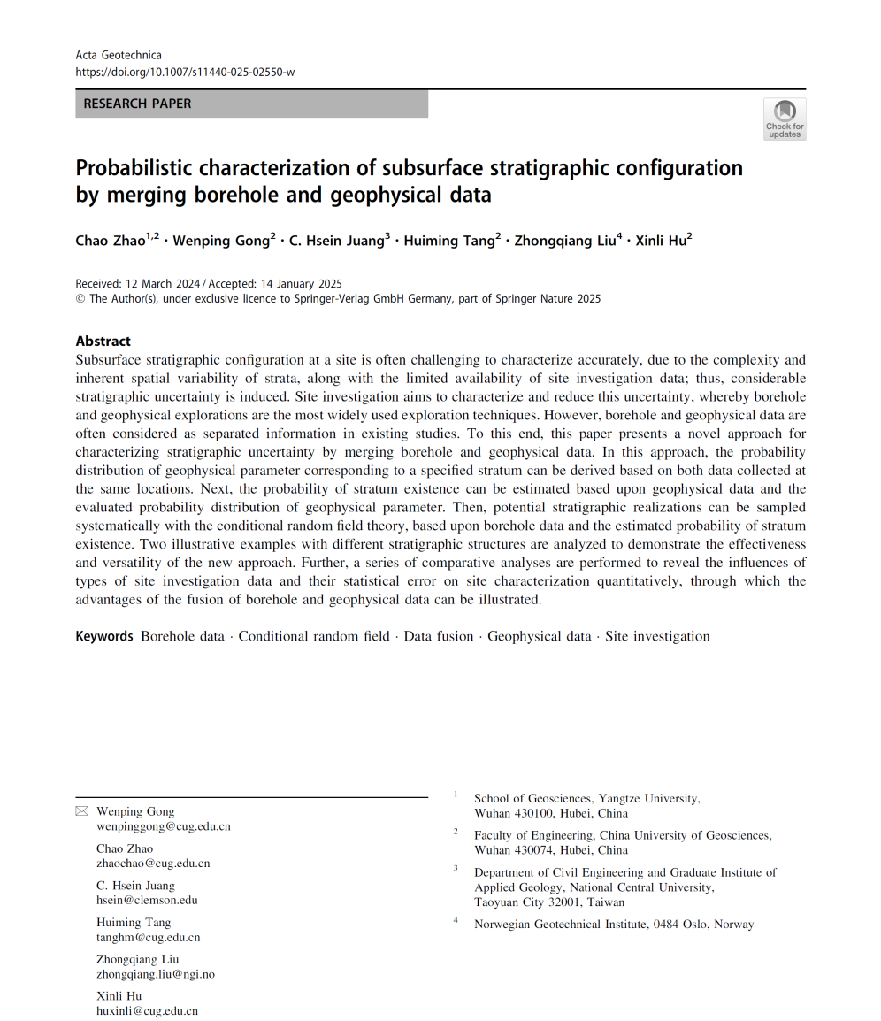 beats365官方网站特任教授赵超在《Acta Geotechnica》发表题为“Probabilistic characterization of subsurface stratigraphic configuration by merging borehole and geophysical data”的研究论文(图1)。赵超为第一作者,beats365为第一完成单位。