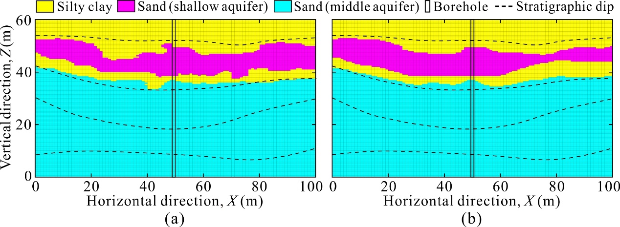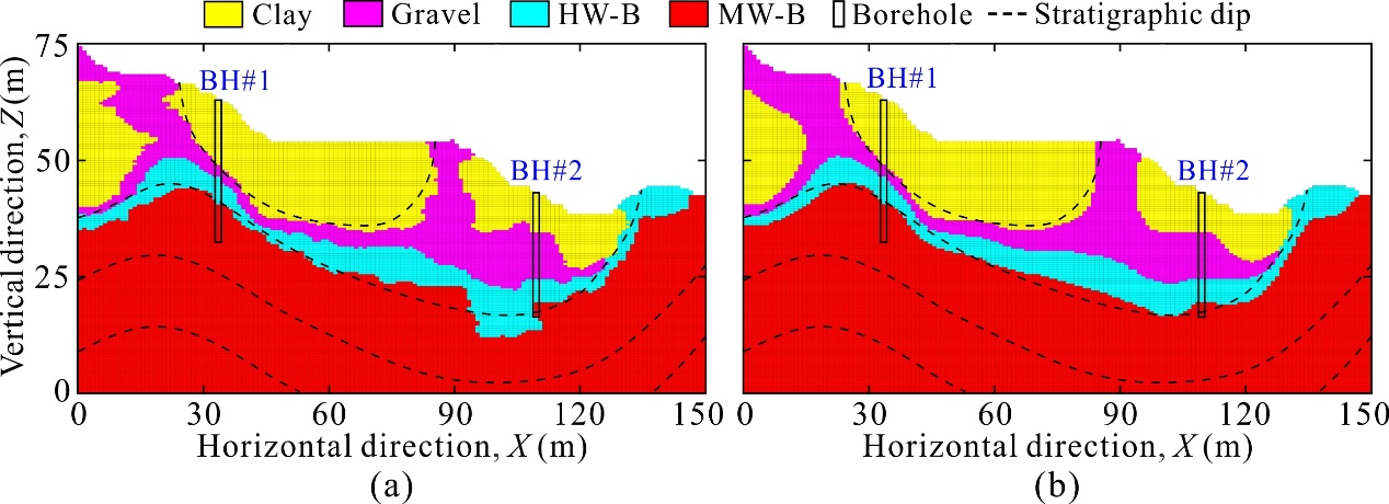 论文以两个典型工程实例为依托,系统验证了该方法在水平层状地层结构与褶皱型复杂地层结构中的适用性与稳健性(图2-3)。研究结果表明:相较于仅采用钻孔数据或仅采用地球物理数据的建模方式,融合多源勘探数据的概率建模方法能够显著降低地层不确定性、提高地层结构识别精度。同时,研究还进一步将该方法应用于工程场地勘探方案优化,结果显示,在保证建模精度的前提下,融合物探数据可大幅降低钻探工作量,显著提升工程勘察的经济性与效率。