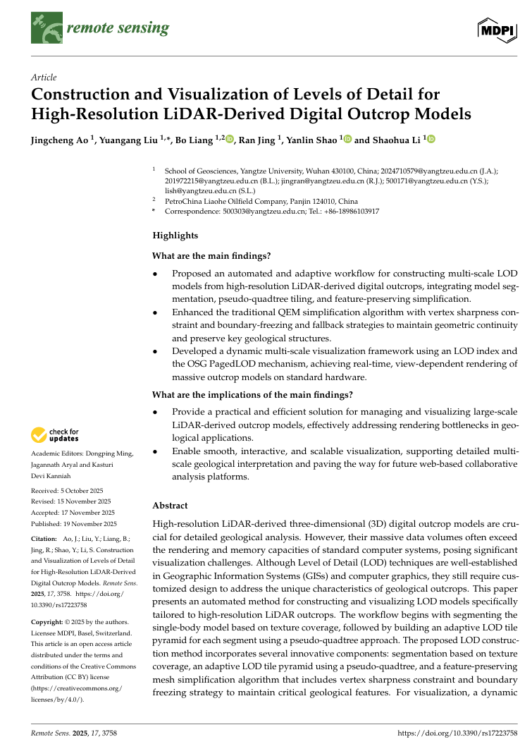 beats365官方网站硕士生敖竞成在遥感领域期刊《Remote Sensing》发表题目为“Construction and Visualization of Levels of Detail for High-Resolution LiDAR-Derived Digital Outcrop Models”的研究论文(SCI二区,影响因子4.1)。beats365官方网站为论文第一署名单位,硕士研究生敖竞成为论文第一作者,其导师刘远刚副教授为通讯作者。