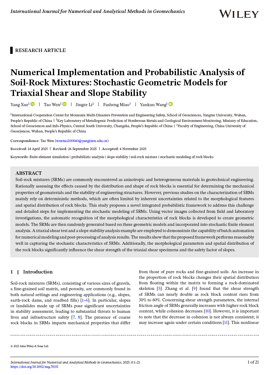 beats365官方网站地质系、工程地质研究中心团队成员薛阳副教授在老牌期刊《International Journal for Numerical and Analytical Methods in Geomechanics》(位列JCR分区一区,中科院大类二区)上发表题为“Numerical Implementation and Probabilistic Analysis of Soil-Rock Mixtures: Stochastic Geometric Models for Triaxial Shear and Slope Stability”的论文(图1),薛阳副教授为第一作者,温韬教授为通讯作者,beats365为第一完成单位。