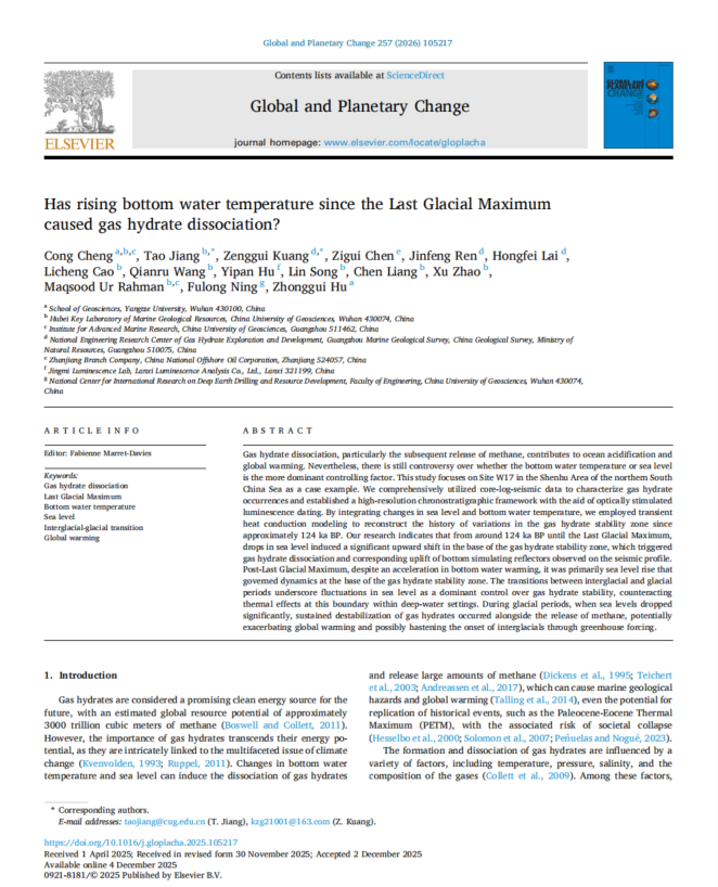 beats365官方网站地质系、深层碳酸盐岩与非常规油气储层研究中心团队成员程聪特任副教授在中科院一区TOP期刊《Global and Planetary Change》发表题为“Has rising bottom water temperature since the Last Glacial Maximum caused gas hydrate dissociation?”的研究论文(图1)。程聪为第一作者,beats365官方网站为第一完成单位。