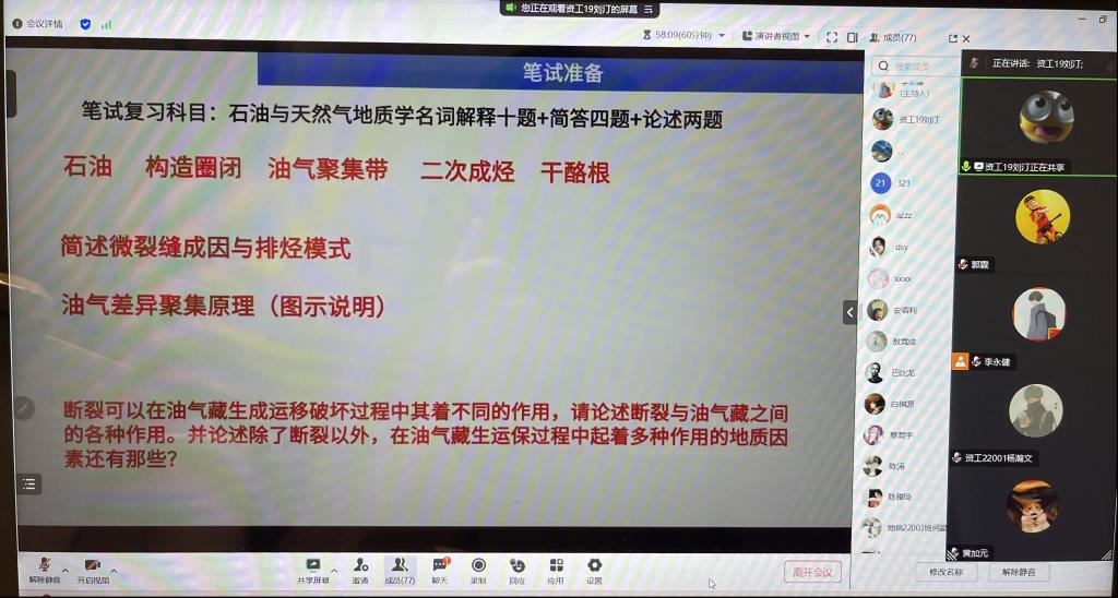 马福康同学介绍了中国石油大学(北京)的复试流程,针对PPT自我介绍环节,他建议从专业课成绩、科研经历、未来研究方向等方面进行展示,并回忆了十几道去年的复试真题,供大家参考。对于同学们头疼的专业英语问答环节,目前就读于中国地质大学(北京)的白棋源同学说,《专业英语》课程教材就是最好的复习资料,并建议大家将英语名词解释作为复习重点。对于英语自我介绍环节,他提醒同学们一定要提前准备确保流畅,以免紧张影响发挥。