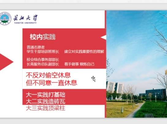 30日晚7点,樊柯廷、李康、王明敏3名同学分别进行学习经验分享。首先为我们做分享的是樊柯廷。他从自己的实践经历告诉我们,想做好一件事,你必须要有积极的态度,紧接着他又说“大学可以偷空休息,但不能一直休息,因为大学的意义不仅仅局限于宿舍。”最后,他告诉同学们,“大一实践打基础,大二实践造砖瓦,大三实践顶梁柱。”你可以通过一些企业实习,明白你更适合于什么岗位。紧接着,为我们做分享的是李康。他谈到老员工活要有明确的目标,目标就像你深夜航海时的灯塔。同时也认为大学并不是高中老师所讲的那样绝对自由。在大学,你必须学会自律,才能使得你的目标更加坚定。最后便是要务实,拒绝虚假,在实践中不断探索,这样才能更加深刻地去了解任何一件事。最后是王明敏为同学们分享经验。她先从自己方法讲起,她表示自己每天都会把要做的事列一张表格,这样就可以均衡地分配时间。同样地,态度也决定着你能否做好一件事,当你有求真务实的态度,就没有什么事能够难倒你。