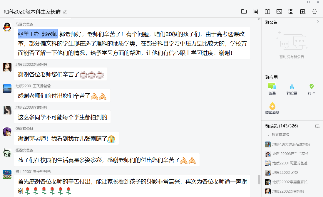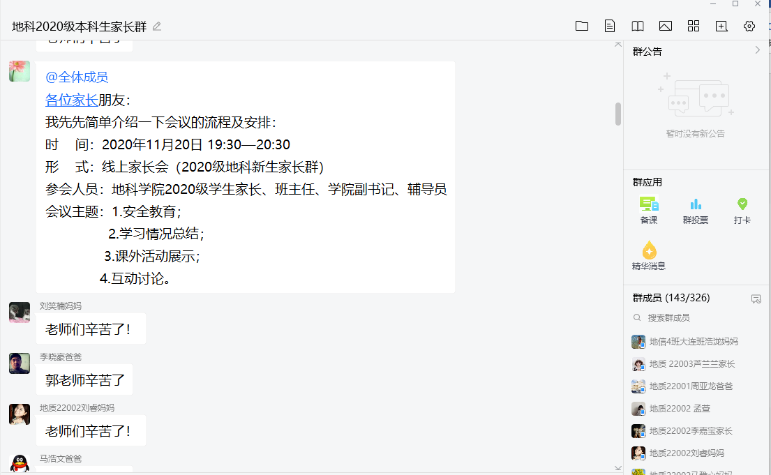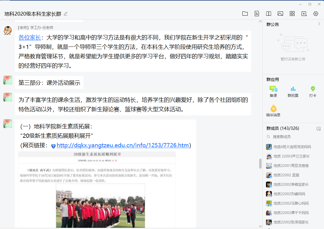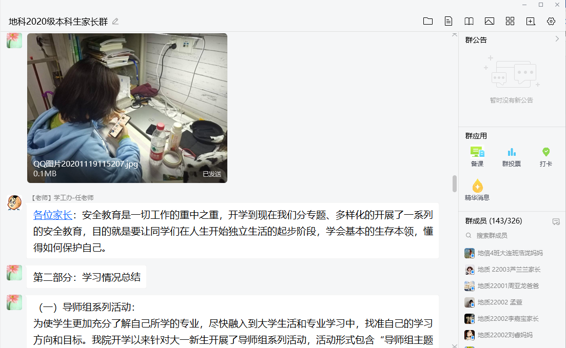 (通讯员:郭霖)11月20日晚7点半,2020级本科生家长群热闹非凡,学工办全体老师与家长们齐聚一堂,召开了20级本科生第一次线上家长会。本次家长会由公司党委副书记任倩老师主持,20级辅导员郭霖老师以“文字+图片”的形式,主要从安全教育、学习情况总结、课外活动三个方面向家长们展示了同学们在校期间的学习与生活。