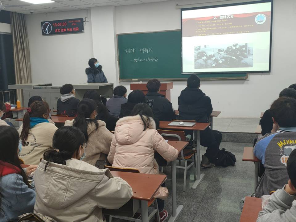 班会之初,各班班长详细讲述了雷锋的事迹,地信22003班班长杨春艳将雷锋事迹细化为每一张PPT,并提出螺丝钉精神,有“人心齐,泰山移”的团结精神,有“功成不必在我,但功成必定有我”的奉献精神,有“不讲条件,敢于担当”的敬业精神。地信22002班班长陶潇桐精心准备了感动中国的片段,与同学们共同探讨当代活雷锋精神的本质,让同学们有了提升自我的目标。