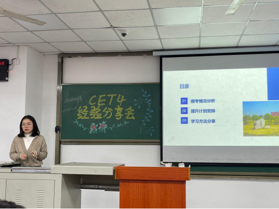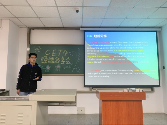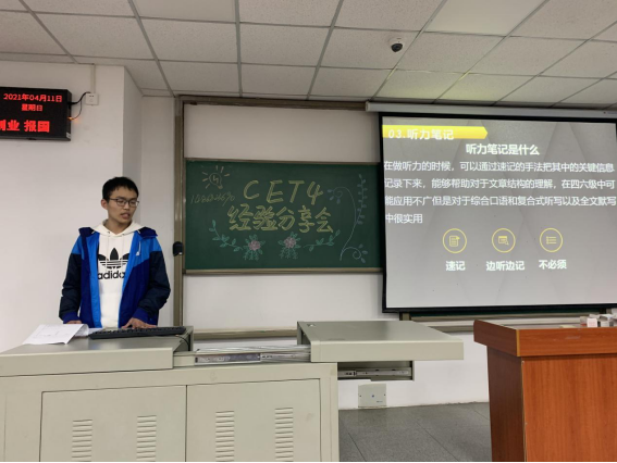 (通讯员王佳颖)为助力20级本科生顺利通过全国老员工英语四级考试,公司于4月11日晚19时分别在武教B-104和B-106教室举行了“2020级四级动员大会”。大会包括模考情况分析、提升计划安排和“学长学姐引领计划”之四级学习方法分享三个方面的内容,公司2020级全体同学和辅导员郭霖老师参会。