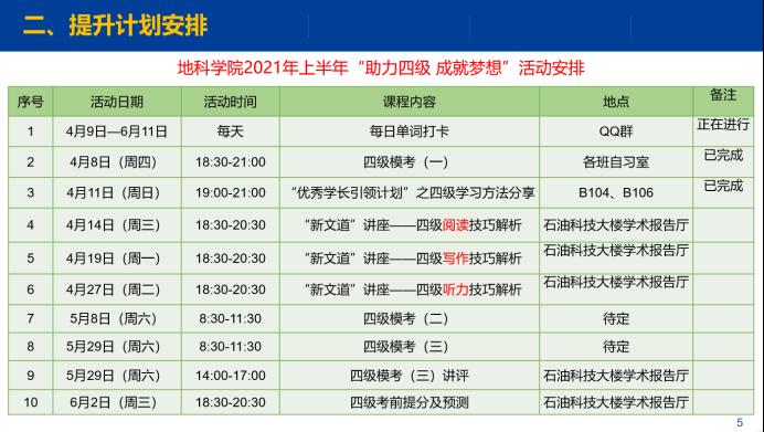 本次活动是公司2021年上半年“助力四级 成就梦想”系列活动的第二场,不仅增进了同学们对四级考试及自身英语水平的了解,更让同学们掌握了的不少学习英语的方法,激发了同学们英语学习的热情与主动性,促进公司学风建设良好发展。