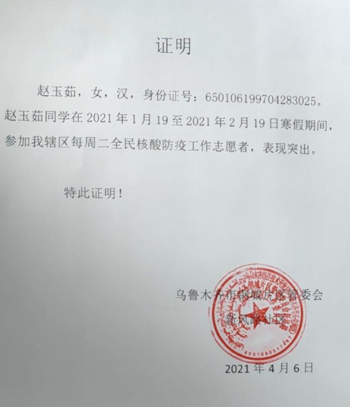 图三 赵玉茹同学受社区管委会赞扬
