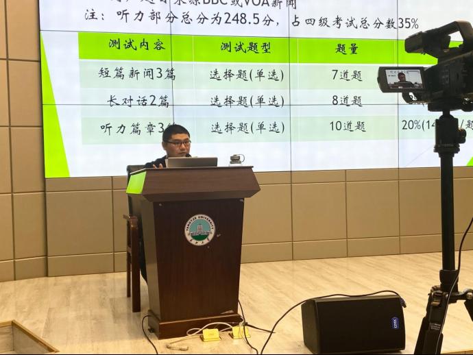 关于四级写作方面,廖青老师为同学们详细介绍了四级考试写作部分的考核要求以及评分原则。“语言是最重要的,文章结构排在第二位,文章内容排在最后,同学们不要拘泥于如何丰富内容,语言流畅、段落清晰是最重要的”。而后,廖青老师指出将简单词汇经过替换变为高级词汇的方法,帮助同学们解决了用词贫乏、句式单一的问题,还为同学们提供了常用句式的总结,帮助同学们掌握了四级写作的技巧。