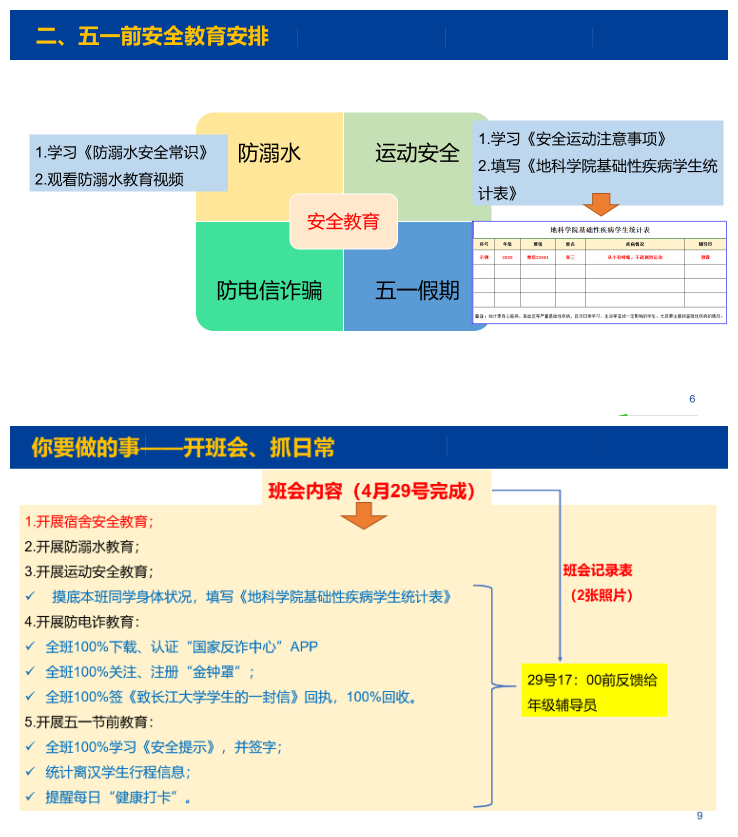 根据会议要求安排,公司所有班级已于4月26日—29日召开五一假期安全教育主题班会,全院员工100%下载实名注册“国家反诈中心”APP、100%关注实名注册“金钟罩”公众号、100%签署防诈“致beats365员工的一封信”回执、100%报备假期离汉行程、100%签署五一假期安全告知书。