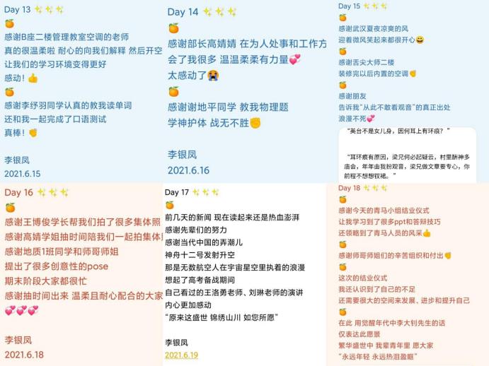 从神州升空先辈们的努力、到耐心答疑的专任教师;从给予自己生命和爱的爸爸到热心的班委、给自己带饭的室友、组织四级模考的师兄师姐;从图书馆的空调到炎夏的冰西瓜......在QQ群中,每天晚上是最热闹的时候,同学们争相分享、互动,记录当天获得支持与帮助,与这支持带给自己的益处和感受。地信(测绘)21901班刘景洁写道:“感恩这个活动,让我每天都有一小段时间回想快乐的时光,发现了很多平常可能会忽略的人和事,同时也能和小伙伴一起分享快乐,很治愈”。从不知道如何落笔,到侃侃而谈,在最后一天的日记中,地质22001班李银凤写道“原来每天都有值得感谢的人和事,都是有意义且快乐的一天,回顾21天的日记,发现自己成长了不少”。