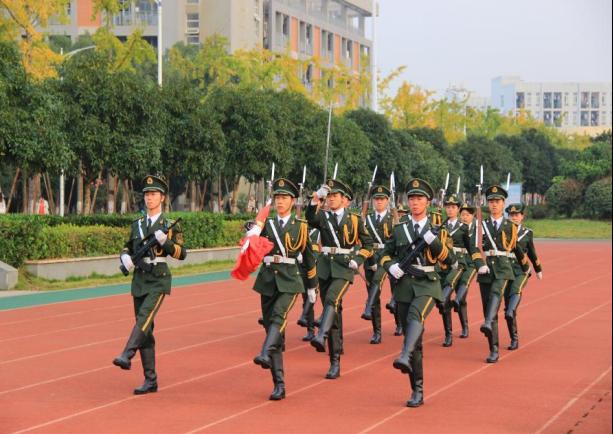 威武庄严的国旗护卫队精神抖擞、身姿挺拔,迈着铿锵有力、整齐划一的步伐行进至升旗台下。