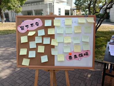 线下阶段“留下不安,带走温暖”有奖互动于11月27日在校内四栋寝室楼下开展,通过“用助眠眼罩,交换你的不安”与“手绘卡片,传递温暖”两个环节,让同学们在考试月临近时,有一个倾诉烦恼的有效渠道。同学们踊跃地在现场的展板上贴上写着自己烦恼与焦虑的便利贴,并向生活中曾带给自己温暖的同伴用文字表达感谢。