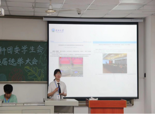 接下来是第十一届主席团与部长竞选角逐环节。同学们自信坚定地迈上讲台,介绍自己的竞选优势和未来工作计划。地信(产业)22001班刘亚唯同学昂首挺胸第一个上台,不仅介绍了他负责文艺部期间所取得的成绩与收获,还表示了对当选新一届主席团成员的信心与渴望。共有六位同学竞选主席团,二十余位同学竞选各部门部长。