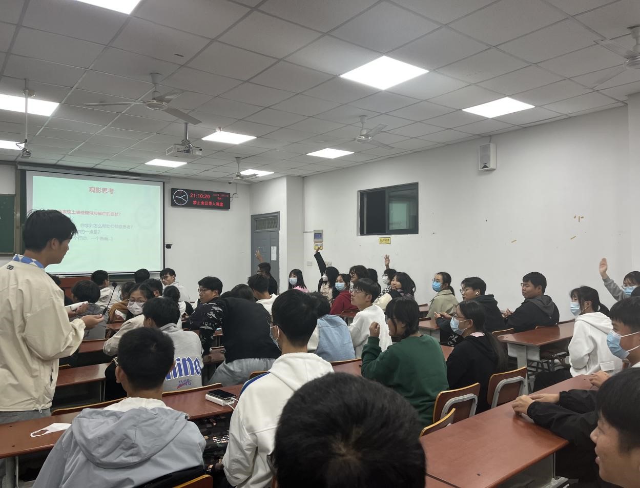 (通讯员 杜民意 李弘扬)在“世界精神卫生日”到来之际,为引导同学们重视情绪健康,2022年10月10日晚19:00,公司员工会心育部在A210面向22级新生举办心理电影沙龙。活动共吸引110名新生参加,王红桥老师担任主讲,大家共同分享有关对抗抑郁症、爱与陪伴的电影——《丈夫得了抑郁症》。