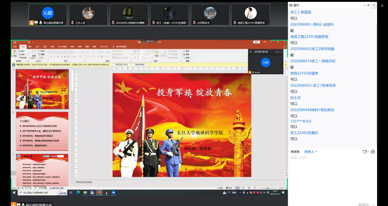 最后杨沁超希望参会成员能够积极宣传,让更多有意愿参军的同学能够早日实现自己的“军旅梦”。