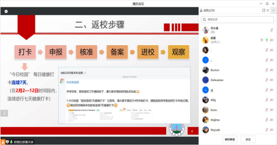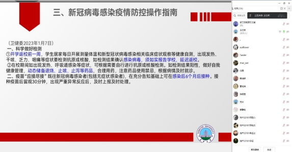 主题班会从返校时间安排、返校步骤、新冠病毒感染疫情防控操作指南学习、春季学期重点工作四个方面展开。首先,辅导员老师为同学们讲解了返校及开学的时间安排,并向大家强调不能擅自提前返校。接下来,辅导员老师对返校的6步骤逐一进行了讲解,特别是对“打卡”和“申报”环节,要求返校员工必须保证连续7天健康打卡,延迟返校员工需严格办理延迟返校手续。随后,组织全体员工集中学习了《新冠病毒感染疫情防控操作指南》,要求科学做好检测,确保疫苗“应接尽接”,倡导做好个人防护。最后将期末考试、英语四六级考试、毕业生就业及考研复试工作进行了强调与动员,特别强调了考风考纪,要求参考员工严格遵守考试纪律。