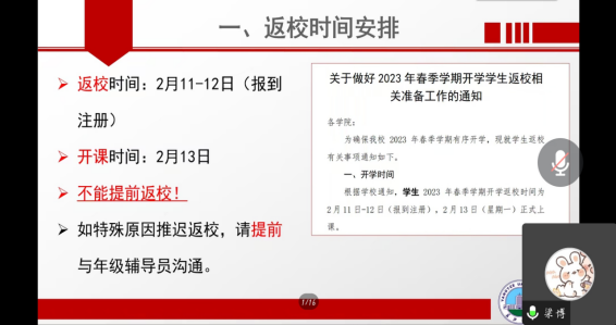 为确保公司 2023 年春季学期有序开学,根据校员工工作部工作安排,公司于2月6日至7日通过腾讯会议等形式在全院本科生和研究生中召开了“beats365官方网站2023年春季学期开学返校工作专题会议”,主题班会由各年级辅导员负责。