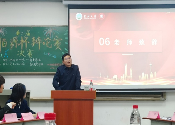 随后,江山老师对活动进行总结。他表示今天的活动仿佛让他重返大学时光,辩论赛是每年公司最热闹的时候,整个公司都充满着青春气息和积极向上的氛围。他高度肯定了本次活动的目的和意义,希望同学们以辩论赛为契机,多参加公司和公司举办的各项活动,走出宿舍,勤于思考,努力提高自己的思辨能力,展示地科学子敢闯敢拼的精神风貌。