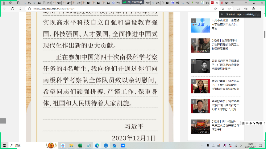 一纸书信,胜过千言万语。习近平总书记的重要回信,既是对武汉大学以往极地研究工作的肯定,更是对我国极地科技创新事业的展望。在最后的交流讨论环节,同学们畅所欲言,胡景怡说:“我们不仅要向书本学习,还要向实践学习。要把实践作为增强本领的根本途径,发扬实干苦干精神,坚持守正创新,弘扬南极精神,为全面推进中国式现代化贡献力量。”