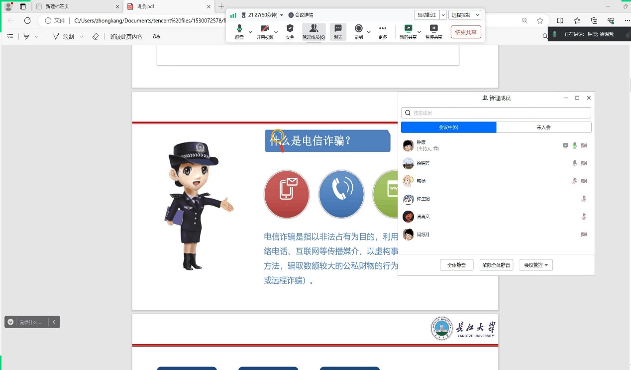 首先,老师们就“什么是电信网络诈骗”、“电信网络诈骗的双面影响”、“电信网络诈骗类别”、“如何提高诈骗意识”、“常见诈骗套路揭秘”以及“如何用好反诈利器”六个方面进行反诈宣传和教育,提醒同学们要不断学习反诈知识,做到“六个一律”、“四个不要”、“三不一多”,防止上当受骗。同时倡导同学们下载国家反诈中心APP以保护自身财产安全。