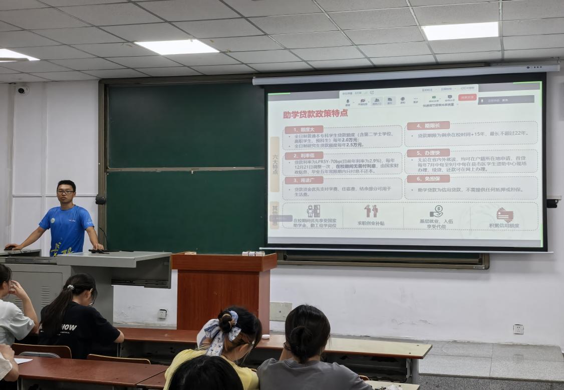 杜子萱和范秀武同学详细介绍公司及公司的奖助政策、公司临时困难补助的申领流程、勤工助学岗位类型和酬劳标准,加深同学们对资助政策的认识,鼓励家庭经济困难等有需求的同学主动了解。