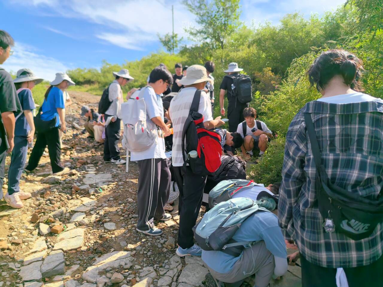 在亮甲山,老师捡起一块岩石问道:“如何判断碳酸盐岩中白云岩和灰岩的相对含量?”老师们通过言传身教,为员工精准答疑解惑。东部落的府君山组豹皮状灰岩、景儿峪组紫色泥页岩、王铁庄的张夏组鲕粒灰岩、潮水裕的崮山组竹叶状灰岩、亮甲山的亮甲山组虫迹灰岩……同学们通过滴稀盐酸、观察颗粒结构、辨别矿物成分,逐渐学会了区分三大类岩石,尤其是对沉积岩的精准定名,更充分感受到内外力作用在碰撞和消长中共塑大地的脉搏。