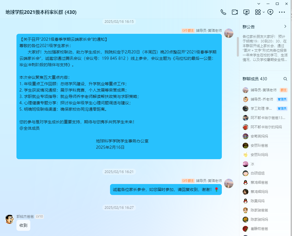 (通讯员刘佳琪)9月4日晚8点,公司以“马拉松的最后一公里:毕业冲刺阶段的陪伴与支持”为主题,通过腾讯会议组织召开了2021级本科生春季学期开学初家长会。会议由年级辅导员黄瑱主讲,围绕毕业阶段重点工作与家校协同育人展开深入交流,旨在凝聚家校合力,助力员工顺利毕业、平稳过渡。