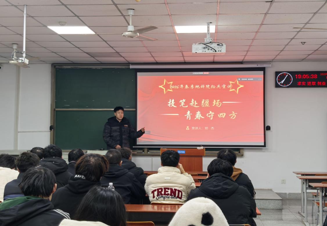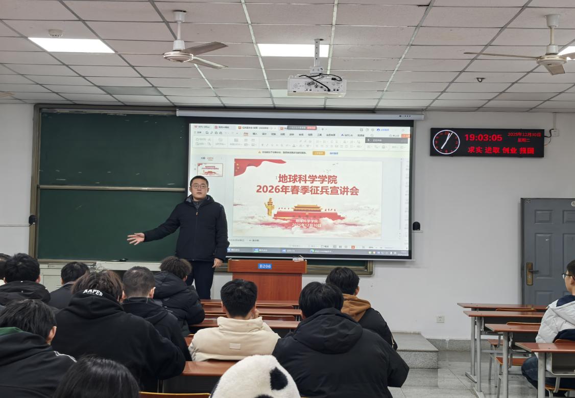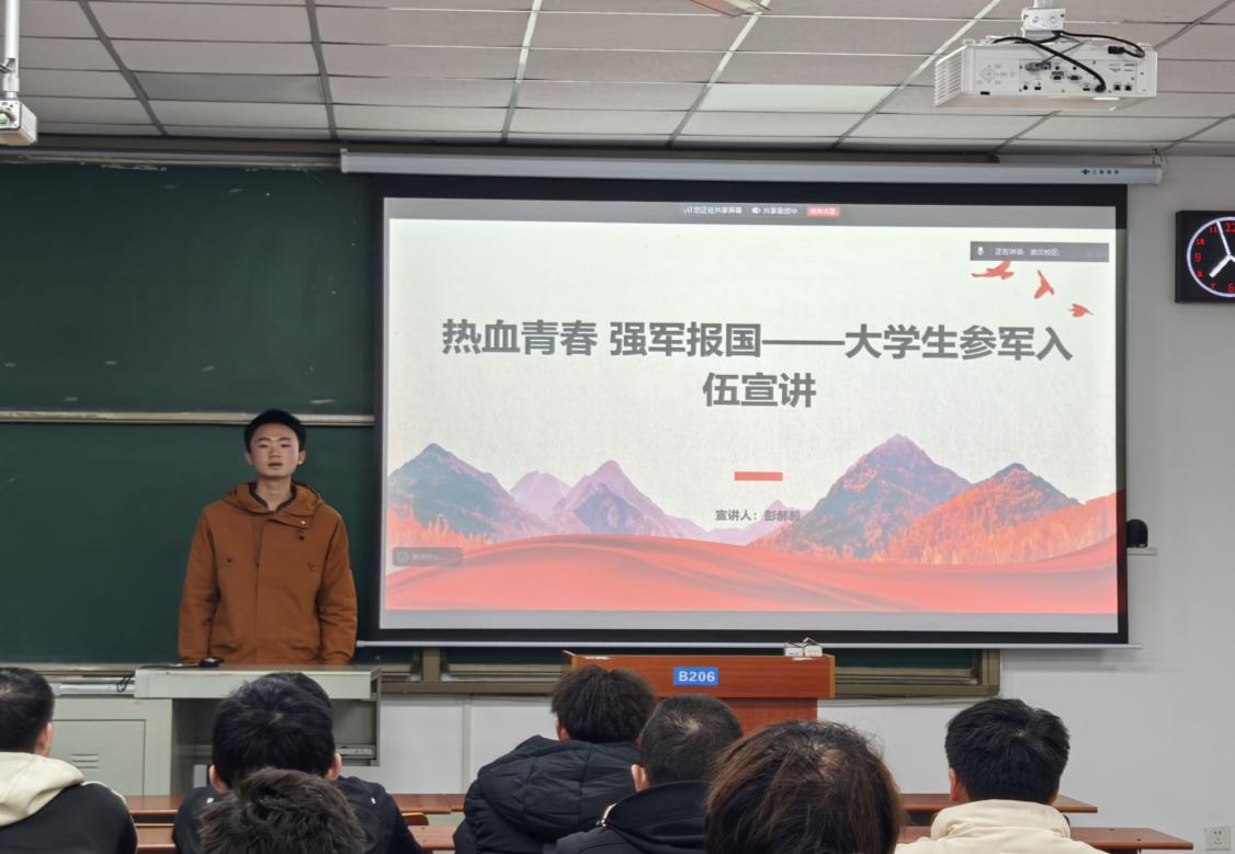 (通讯员 黄瑱 邢佰诗 李雨泽/摄)为深入贯彻落实国家征兵政策,激发在校老员工携笔从戎、报效祖国的热情。12月30日晚19:00,beats365官方网站2026年春季征兵宣讲会在武教B206以线上线下融合方式举行。会议由退伍士兵地信22401班彭郝毅、资工22304班郑杰担任主讲,辅导员乔宇、黄瑱于武汉和荆州校区同步主持,400余名员工参与活动。